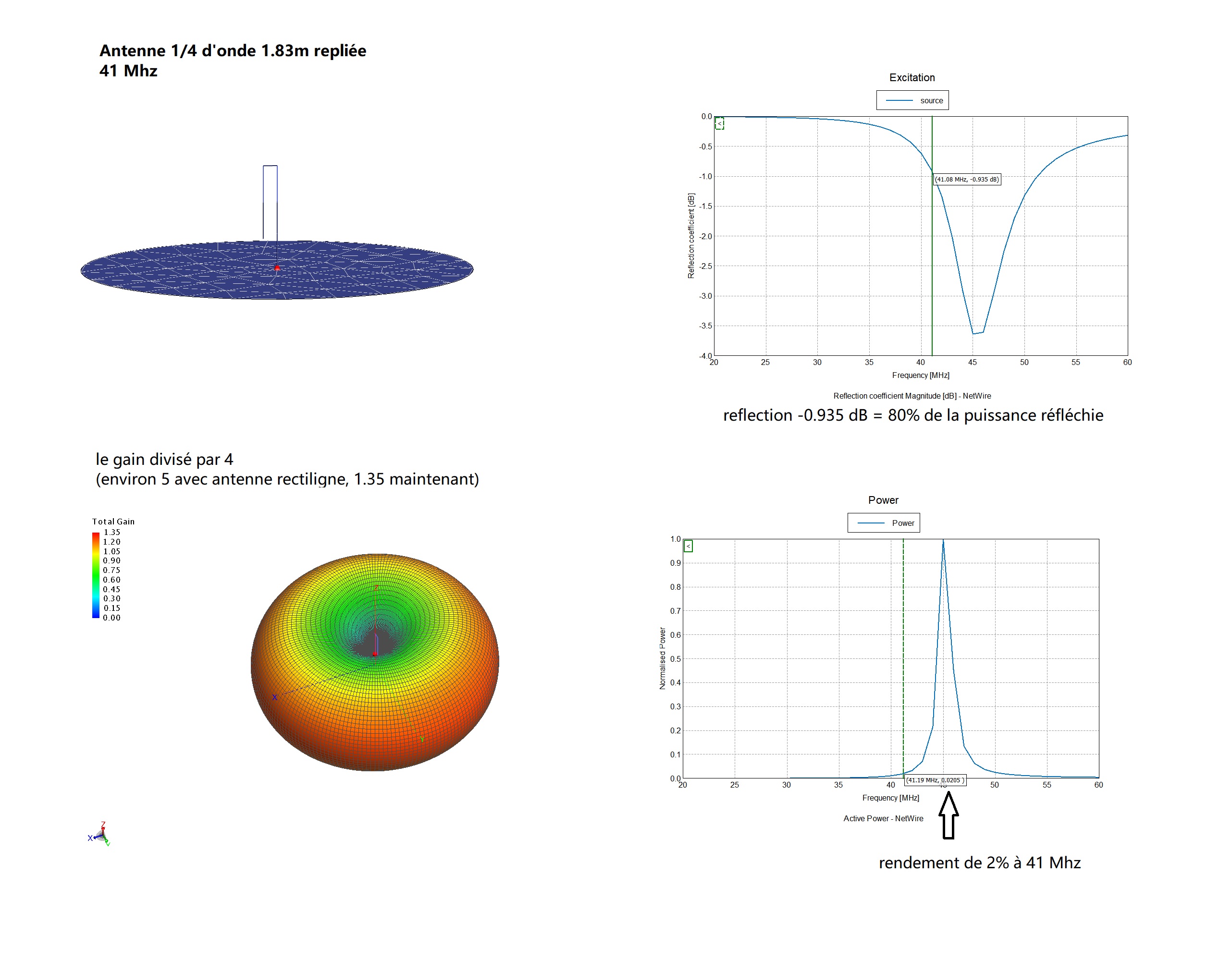 Les simulations montrent que le rendement de l'antenne en 41 Mhz est bien moindre qu'en 433;