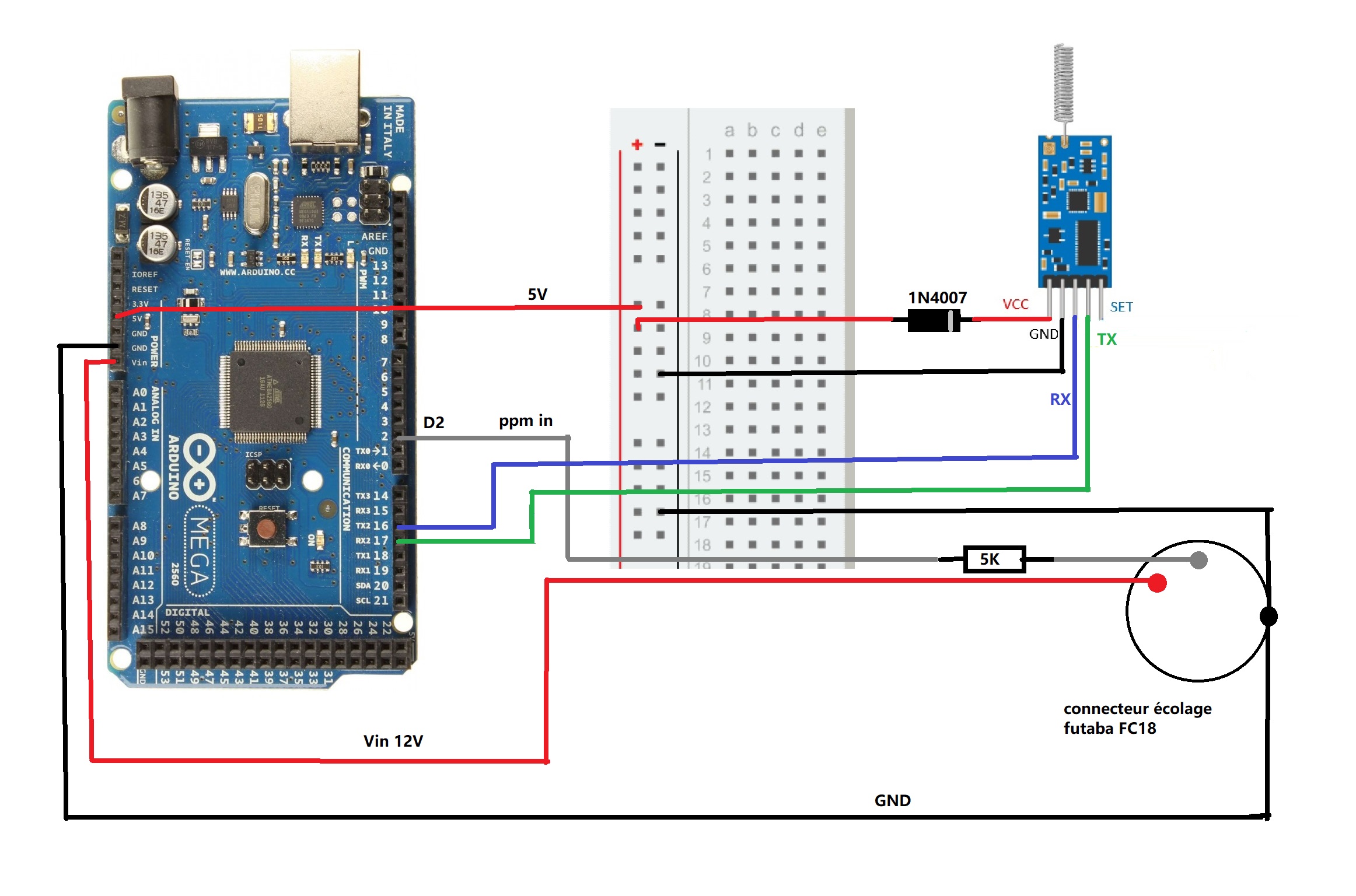 Un connecteur se branche sur la prise écolage et le circuit Arduino est alimenté en 12V par la batterie de l'émetteur et