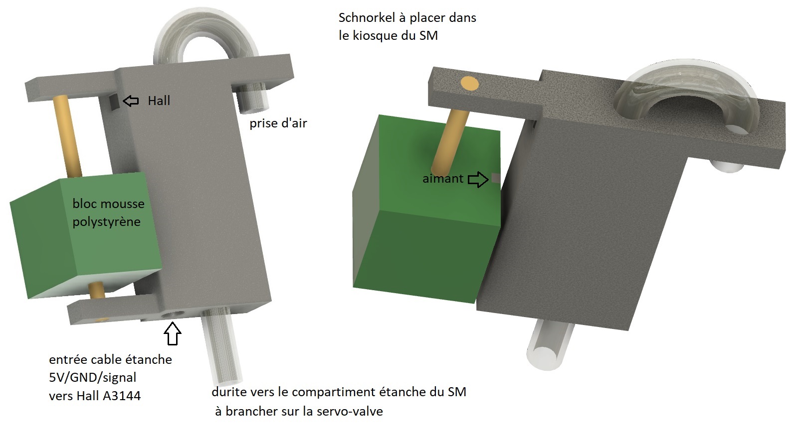 Imprimer le schnorkel en 3D; faire une vitre plexiglas.